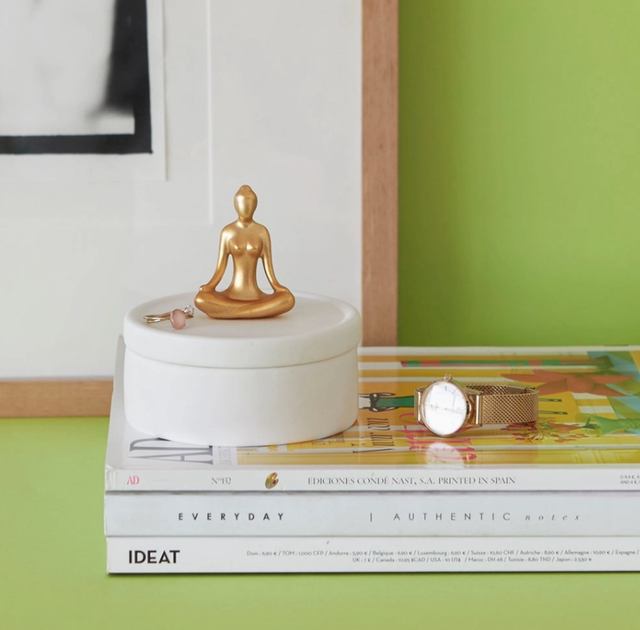 Boîte à bijoux yoga en porcelaine blanche avec figure dorée