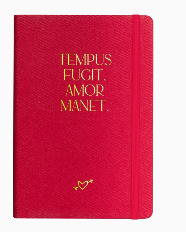 • Couverture : textile enduit (similicuir vegan aspect tissu, doux et résistant), rouge avec dorure « Tempus fugit, amor manet »