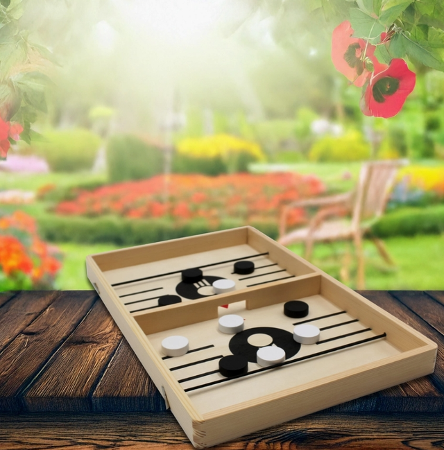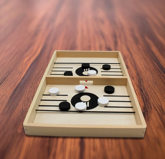 Ce jeu de société plein d'action exige habileté et rapidité, tandis que vous essayez de lancer tous les palets à travers l'ouverture vers le côté adverse.
