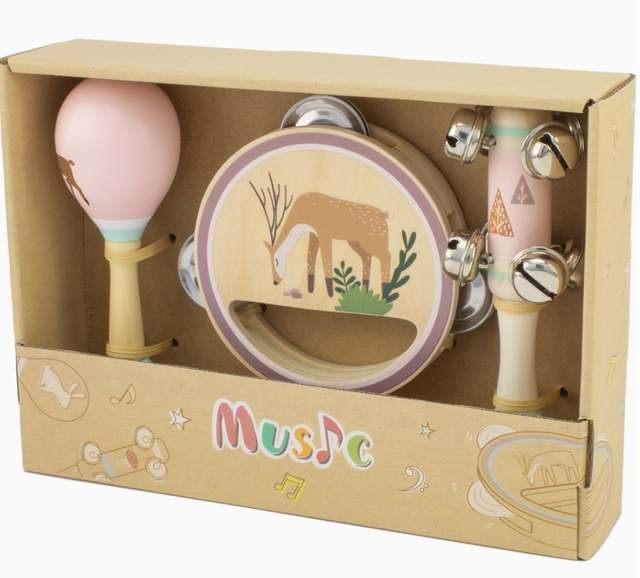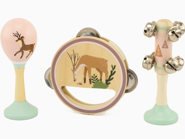 Faites découvrir la musique à vos tout-petits avec notre set musical en bois comprenant trois instruments: une maraca, un tambourin et un hochet avec huit grelots en métal.